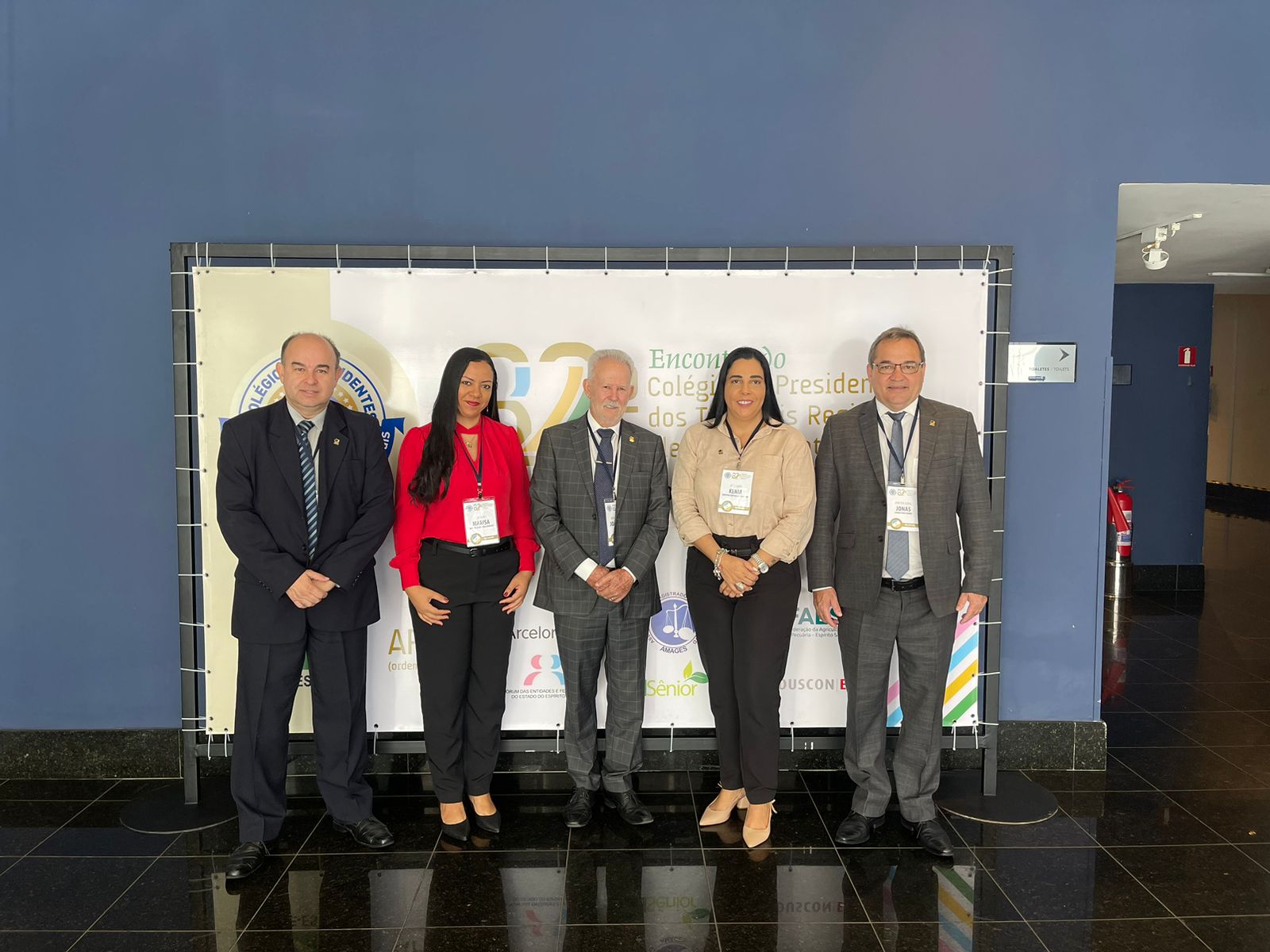 Acompanham o presidente João Rigo Guimarães o diretor-geral do TRE-TO, Jonas Demóstene Ramos; a chefe de gabinete do desembargador no Tribunal de Justiça do Tocantins (TJTO), Kênia Cristina de Oliveira; a assessora-chefe da Presidência do TRE-TO, Marisa Batista Alvarenga Webler; e o assessor de Comunicação Social, Corporativa e Cerimonial, Cristiano Machado Santos.