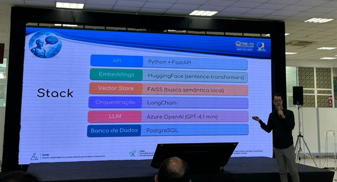 Dentro dessa proposta, o TRE-TO apresenta as soluções desenvolvidas. O secretário Valdenir compartilhou as iniciativas de IA que já fazem parte do trabalho diário no TRE-TO, como o chatbot da Central de Atendimento Virtual ao Eleitor, o assistente de IA integrado ao SEI e o uso de plataformas como Google Gemini Pro, NotebookLM e AgentSpace, voltadas à capacitação, à organização de informações e ao apoio às equipes internas.