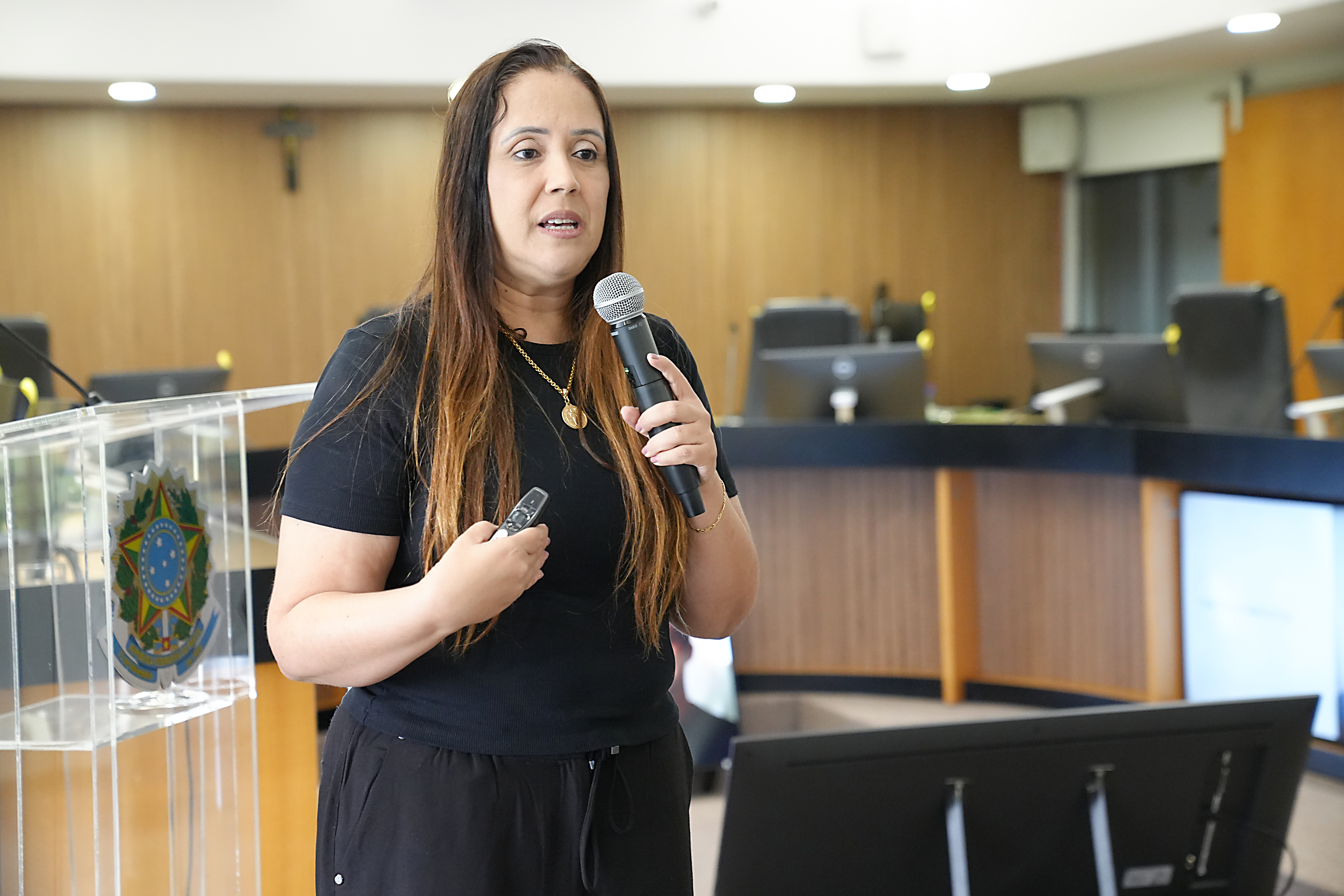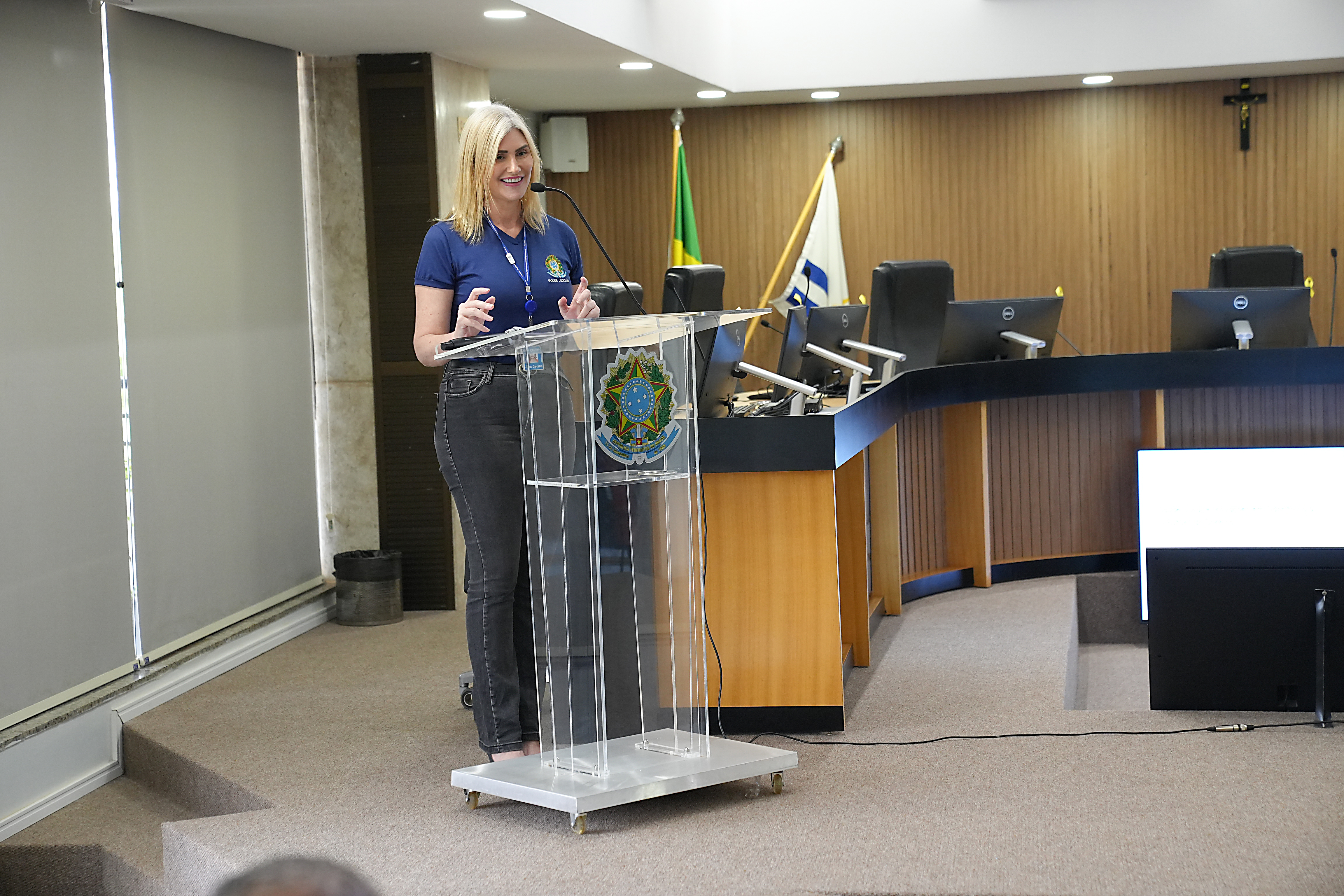 #ParaTodosVerem: A imagem mostra uma mulher em pé, a palestrante Luciana Marquez, segurando um microfone e fazendo uma apresentação para um grupo de pessoas sentadas no auditório. Ela está posicionada à frente, próxima a uma tribuna de acrílico, e atrás dela há uma bancada com computadores e as bandeiras do Brasil e de uma instituição. O ambiente é bem iluminado, com janelas amplas ao fundo e cortinas parcialmente fechadas. O público, composto por homens e mulheres, acompanha atentamente a fala da apresentadora.